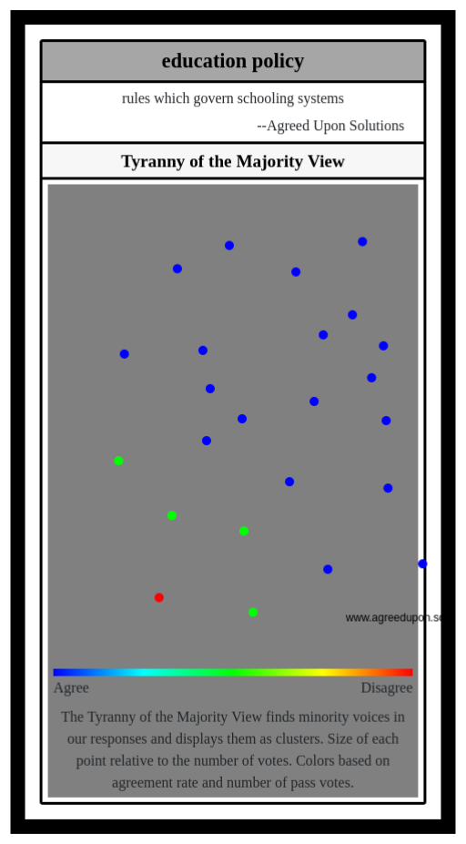 The Tyranny of the Majority View finds minority voices in our responses and displays them as clusters. Size of each point relative to the number of votes. Colors based on agreement rate and number of pass votes.