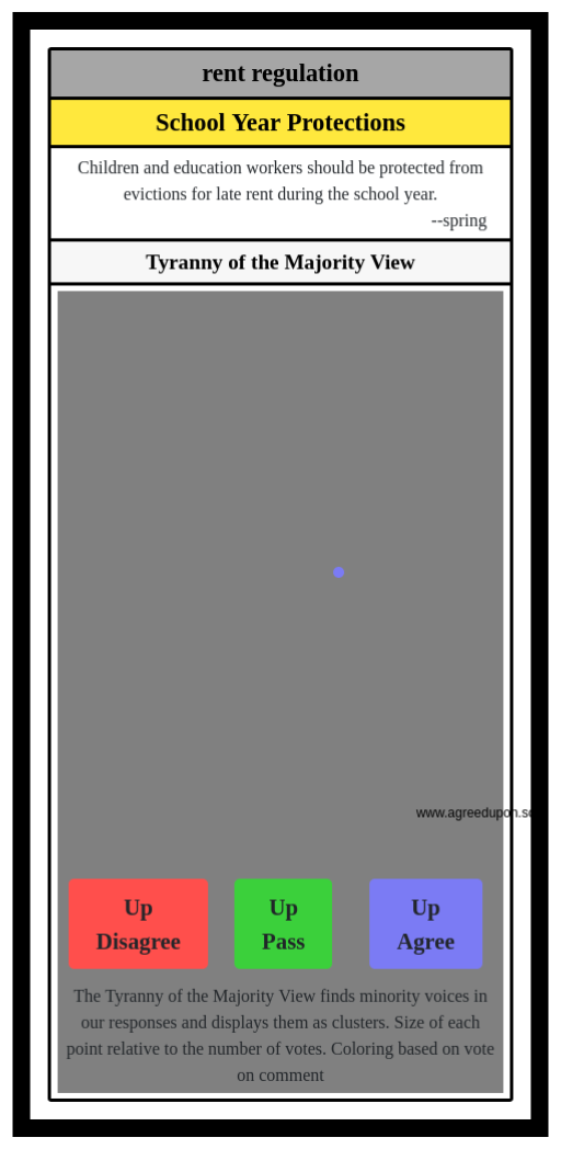 The Tyranny of the Majority View finds minority voices in our responses and displays them as clusters. Size of each point relative to the number of votes. Coloring based on vote on comment