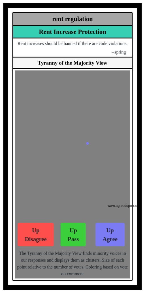 The Tyranny of the Majority View finds minority voices in our responses and displays them as clusters. Size of each point relative to the number of votes. Coloring based on vote on comment