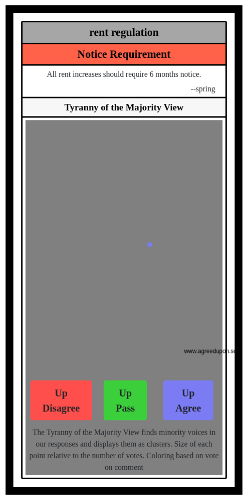 The Tyranny of the Majority View finds minority voices in our responses and displays them as clusters. Size of each point relative to the number of votes. Coloring based on vote on comment