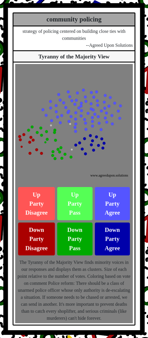 The Tyranny of the Majority View finds minority voices in our responses and displays them as clusters. Size of each point relative to the number of votes. Coloring based on vote on comment