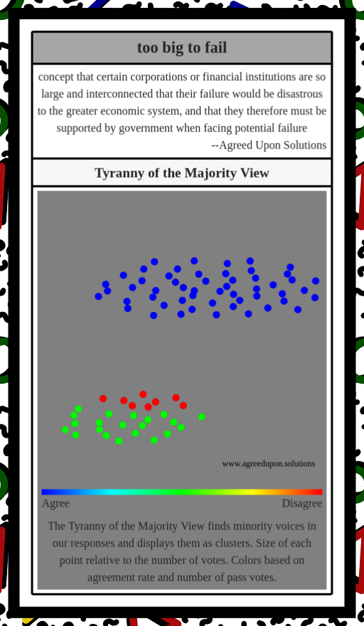 The Tyranny of the Majority View finds minority voices in our responses and displays them as clusters. Size of each point relative to the number of votes. Colors based on agreement rate and number of pass votes.