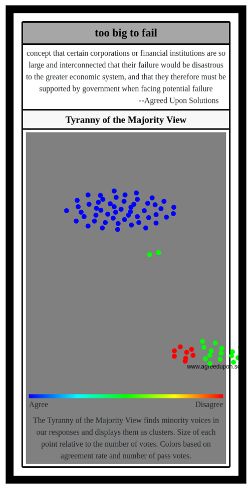 The Tyranny of the Majority View finds minority voices in our responses and displays them as clusters. Size of each point relative to the number of votes. Colors based on agreement rate and number of pass votes.