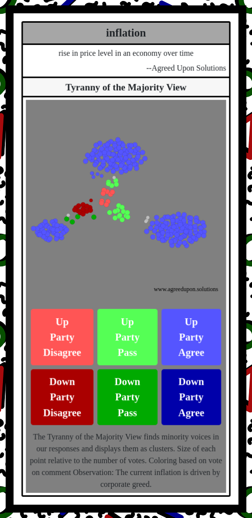 The Tyranny of the Majority View finds minority voices in our responses and displays them as clusters. Size of each point relative to the number of votes. Coloring based on vote on comment