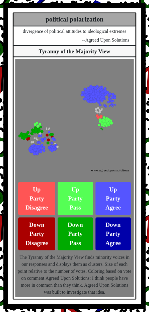 The Tyranny of the Majority View finds minority voices in our responses and displays them as clusters. Size of each point relative to the number of votes. Coloring based on vote on comment