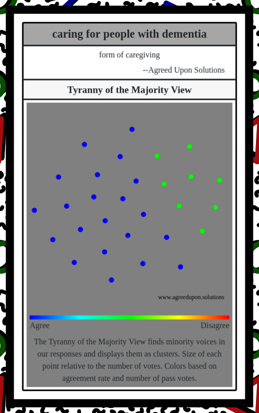 The Tyranny of the Majority View finds minority voices in our responses and displays them as clusters. Size of each point relative to the number of votes. Colors based on agreement rate and number of pass votes.