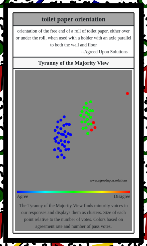 The Tyranny of the Majority View finds minority voices in our responses and displays them as clusters. Size of each point relative to the number of votes. Colors based on agreement rate and number of pass votes.