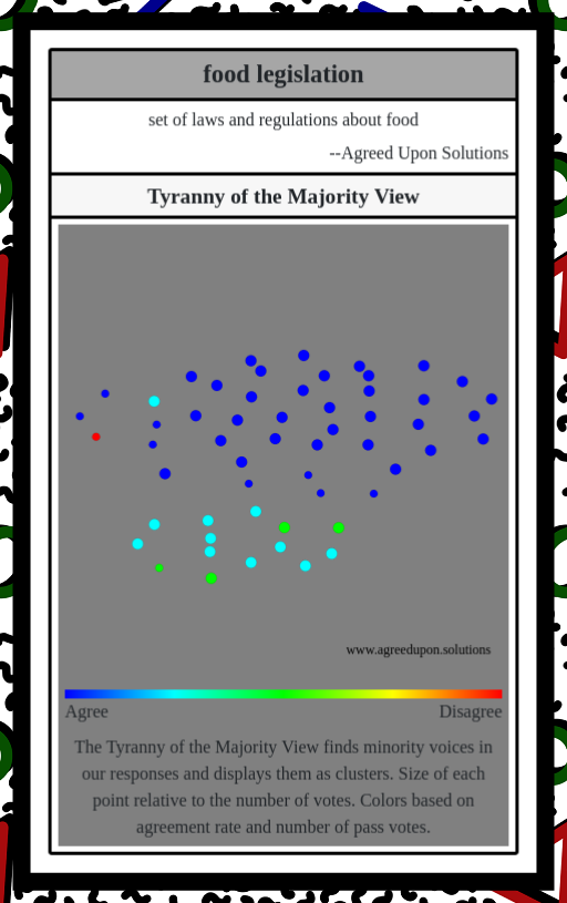The Tyranny of the Majority View finds minority voices in our responses and displays them as clusters. Size of each point relative to the number of votes. Colors based on agreement rate and number of pass votes.