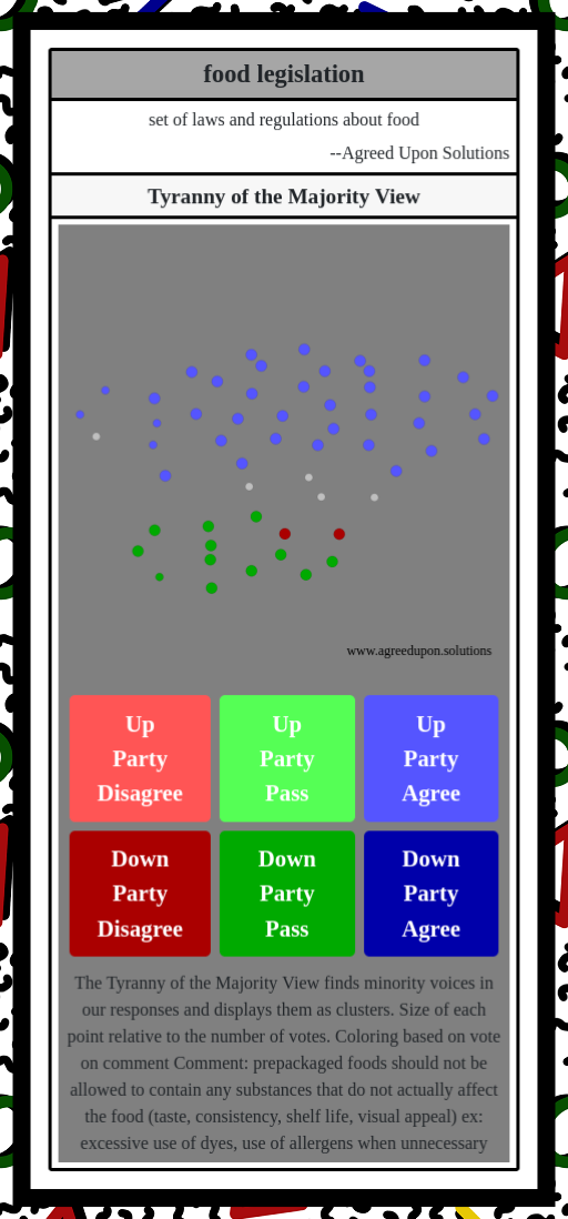The Tyranny of the Majority View finds minority voices in our responses and displays them as clusters. Size of each point relative to the number of votes. Coloring based on vote on comment