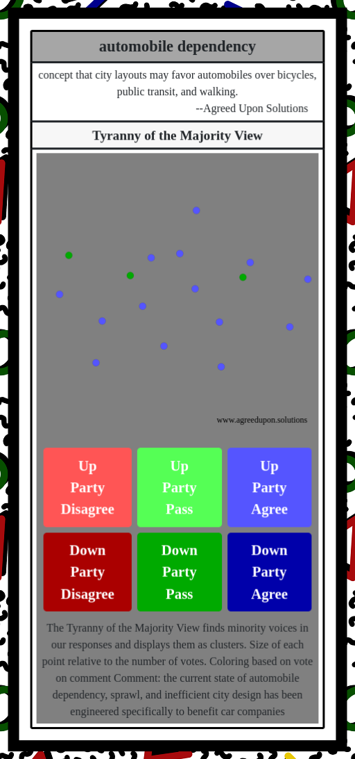 The Tyranny of the Majority View finds minority voices in our responses and displays them as clusters. Size of each point relative to the number of votes. Coloring based on vote on comment