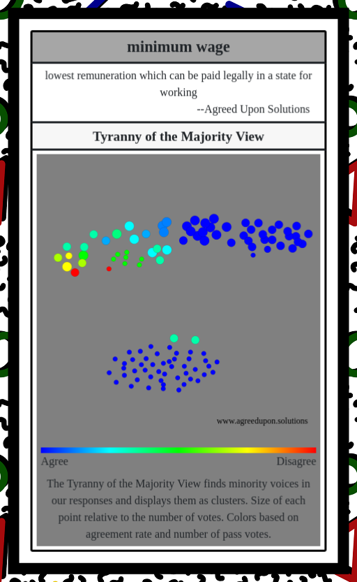 The Tyranny of the Majority View finds minority voices in our responses and displays them as clusters. Size of each point relative to the number of votes. Colors based on agreement rate and number of pass votes.