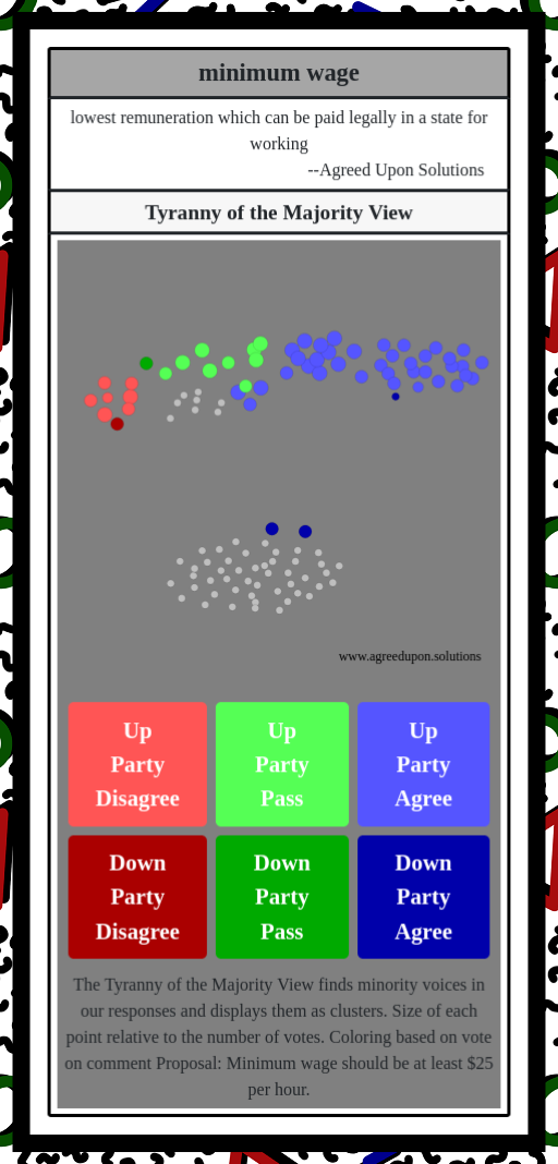 The Tyranny of the Majority View finds minority voices in our responses and displays them as clusters. Size of each point relative to the number of votes. Coloring based on vote on comment