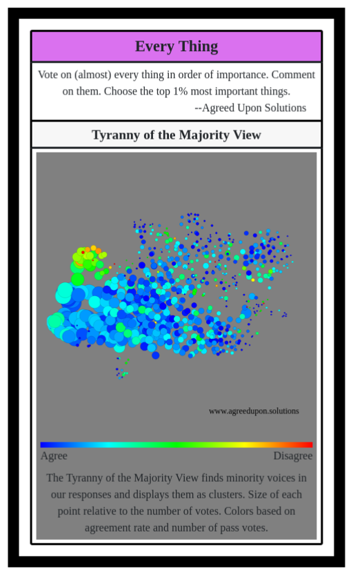 The Tyranny of the Majority View finds minority voices in our responses and displays them as clusters. Size of each point relative to the number of votes. Colors based on agreement rate and number of pass votes.