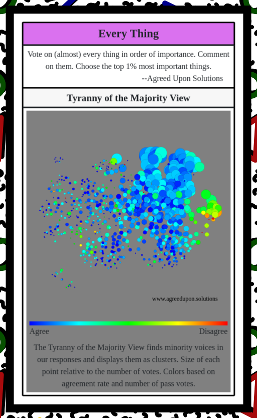 The Tyranny of the Majority View finds minority voices in our responses and displays them as clusters. Size of each point relative to the number of votes. Colors based on agreement rate and number of pass votes.