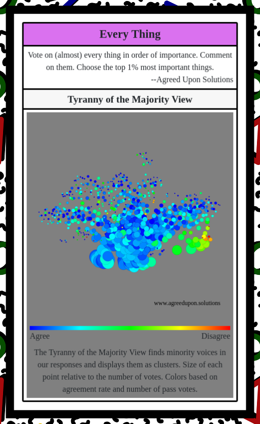 The Tyranny of the Majority View finds minority voices in our responses and displays them as clusters. Size of each point relative to the number of votes. Colors based on agreement rate and number of pass votes.