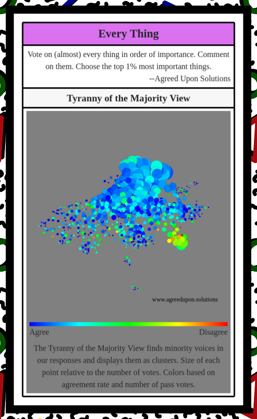 The Tyranny of the Majority View finds minority voices in our responses and displays them as clusters. Size of each point relative to the number of votes. Colors based on agreement rate and number of pass votes.