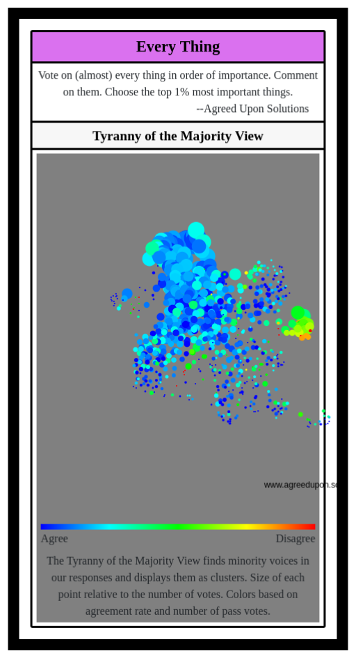 The Tyranny of the Majority View finds minority voices in our responses and displays them as clusters. Size of each point relative to the number of votes. Colors based on agreement rate and number of pass votes.