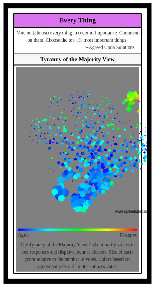The Tyranny of the Majority View finds minority voices in our responses and displays them as clusters. Size of each point relative to the number of votes. Colors based on agreement rate and number of pass votes.