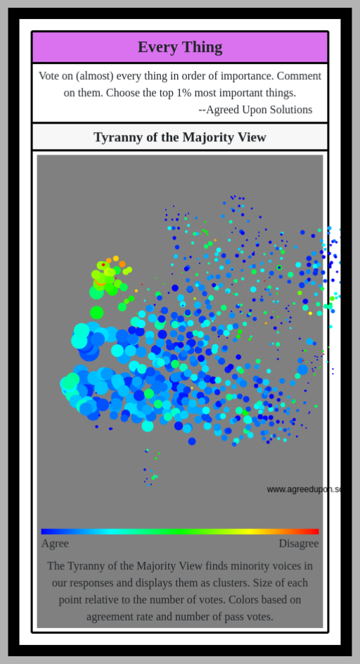 The Tyranny of the Majority View finds minority voices in our responses and displays them as clusters. Size of each point relative to the number of votes. Colors based on agreement rate and number of pass votes.