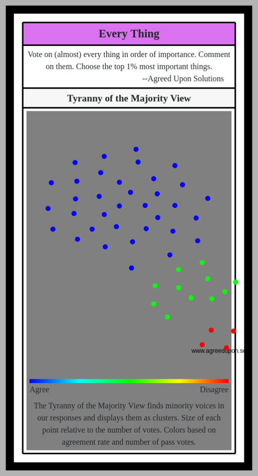 The Tyranny of the Majority View finds minority voices in our responses and displays them as clusters. Size of each point relative to the number of votes. Colors based on agreement rate and number of pass votes.