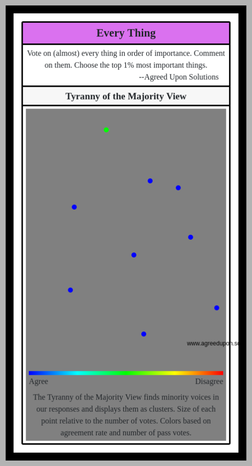 The Tyranny of the Majority View finds minority voices in our responses and displays them as clusters. Size of each point relative to the number of votes. Colors based on agreement rate and number of pass votes.