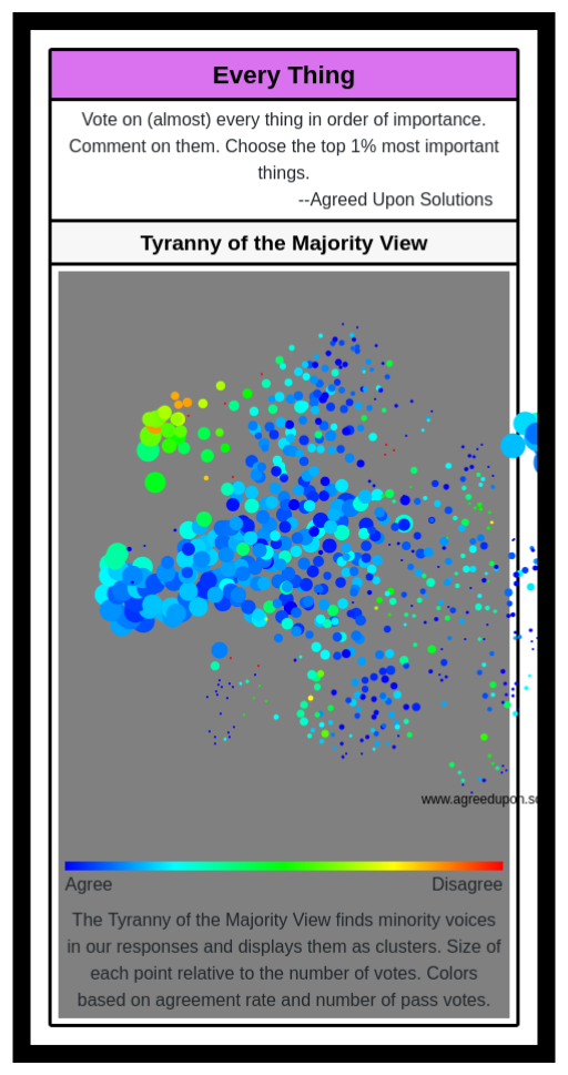 The Tyranny of the Majority View finds minority voices in our responses and displays them as clusters. Size of each point relative to the number of votes. Colors based on agreement rate and number of pass votes.