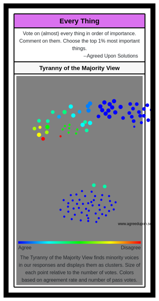 The Tyranny of the Majority View finds minority voices in our responses and displays them as clusters. Size of each point relative to the number of votes. Colors based on agreement rate and number of pass votes.