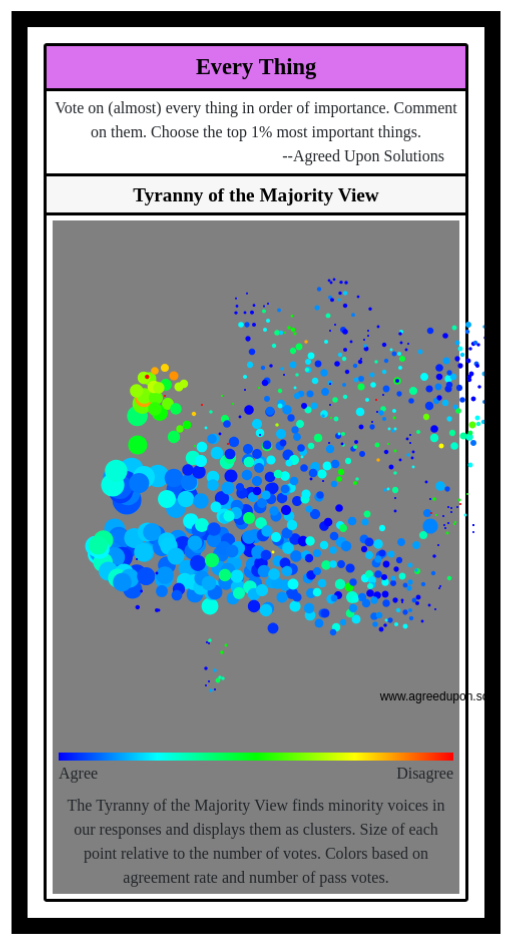 The Tyranny of the Majority View finds minority voices in our responses and displays them as clusters. Size of each point relative to the number of votes. Colors based on agreement rate and number of pass votes.