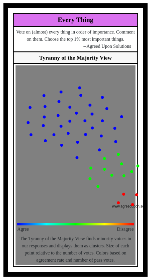 The Tyranny of the Majority View finds minority voices in our responses and displays them as clusters. Size of each point relative to the number of votes. Colors based on agreement rate and number of pass votes.