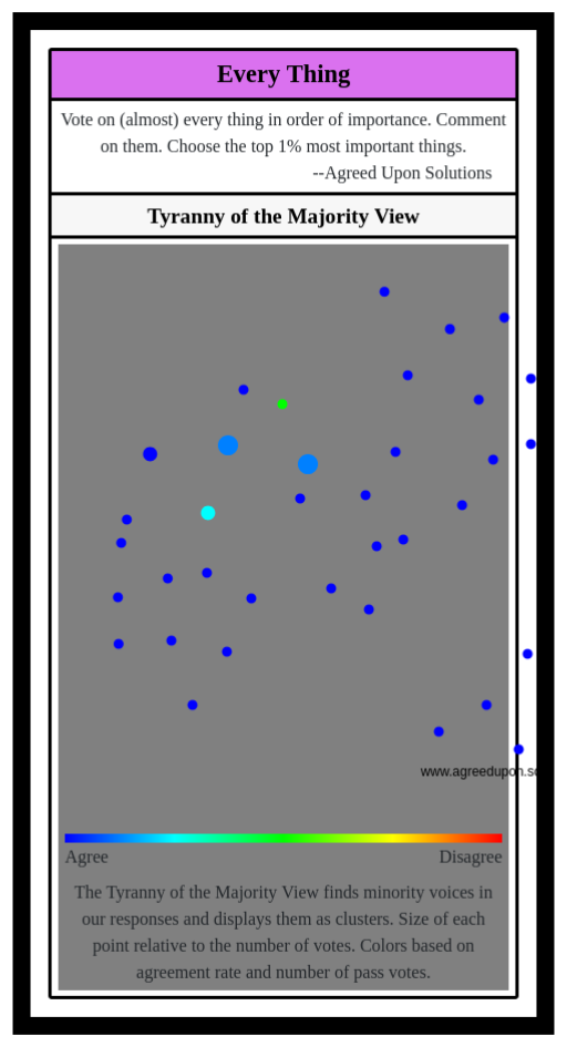 The Tyranny of the Majority View finds minority voices in our responses and displays them as clusters. Size of each point relative to the number of votes. Colors based on agreement rate and number of pass votes.