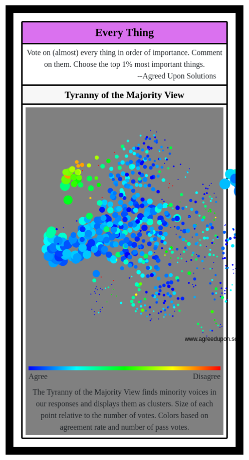 The Tyranny of the Majority View finds minority voices in our responses and displays them as clusters. Size of each point relative to the number of votes. Colors based on agreement rate and number of pass votes.