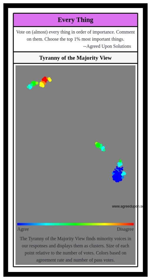 The Tyranny of the Majority View finds minority voices in our responses and displays them as clusters. Size of each point relative to the number of votes. Colors based on agreement rate and number of pass votes.